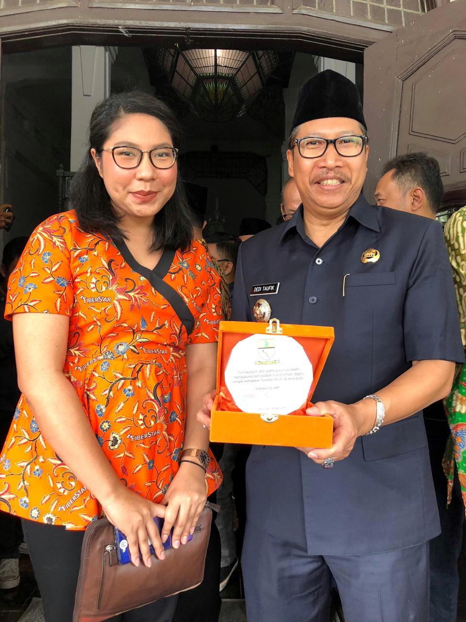 Penyerahan Plakat oleh Rossi Aprianti, Corporate Communication Manager Fiberstar (kiri), bersama Bapak Dr.H.Dedi Taufikurohman M.Si, selaku Pj. Wali Kota Cirebon (kanan).