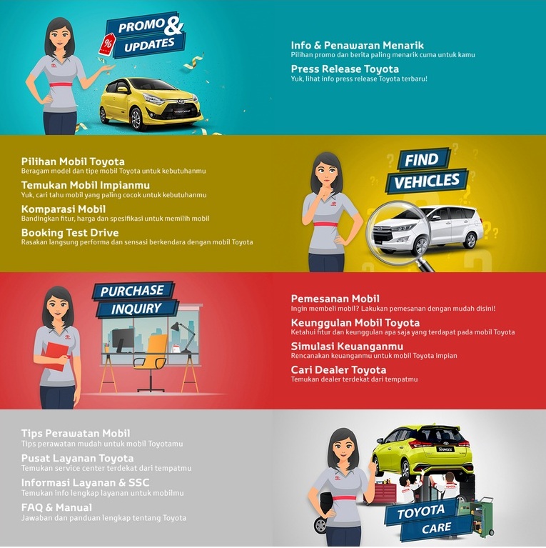 Saat ini, Tarra dapat membantu memberi informasi mengenai Promo & Updates, Find Vehicles, dan Toyota Care.