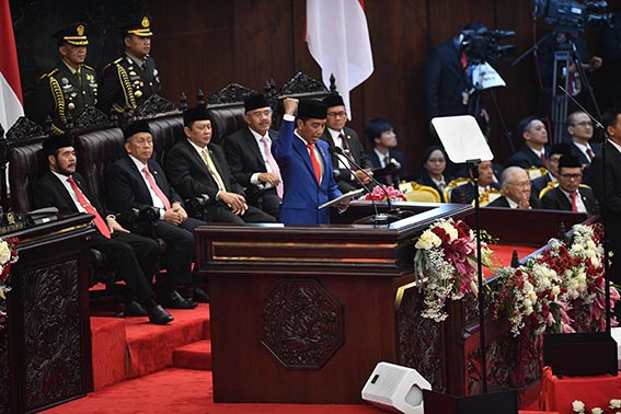 Presiden Joko Widodo menyampaikan pidato dalam Sidang Tahunan MPR di Kompleks Parlemen, Senayan, Jakarta, Jumat (16/8/2019). ANTARA FOTO/Sigid Kurniawan/ama.