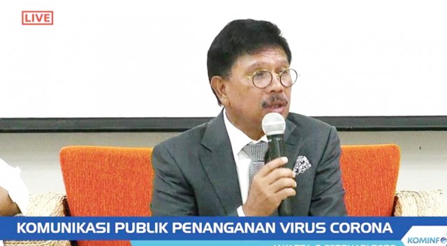 Menteri Komunikasi dan Informatika Johnny G. Plate menyatakan, hingga Senin, 3 Februari 2020, telah ditemukan sebanyak 54 informasi hoaks yang tersebar melalui media sosial dan platform pesan instan. “Hasil pantauan Tim AIS Kementerian Kominfo, ada 54 informasi hoaks. Isinya beragam, mulai dari soal sumber penyebaran, ada kabar pasien di rumah sakit beberapa daerah terkena Virus Corona, hingga soal pencegahan dan penyembuhannya,” papar Menteri Kominfo Johnny dalam paparan pers (3/2), mengenai Komunikasi Publik Penanganan Virus Corona di Kantor Kementerian Kominfo, Jakarta.