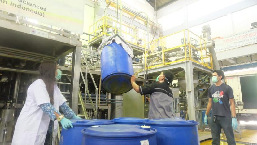 LIPI dengan dukungan Danone Indonesia memproduksi disinfektan dan hand sanitizer di fasilitas Pilot-Plant Laboratorium Pusat Penelitian Kimia LIPI di Serpong, Tangerang Selatan, Banten.