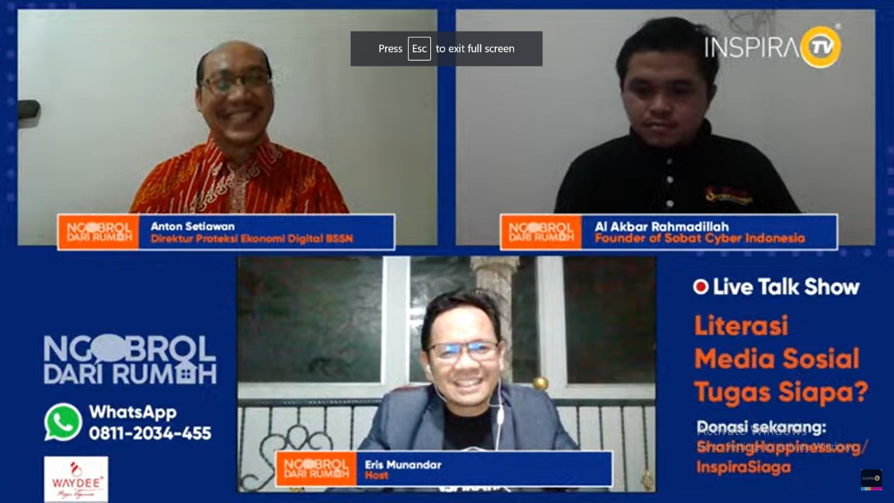 Demikian diungkapkan Direktur Proteksi Ekonomi Digital BSSN Anton Setiawan dalam acara “Ngobrol Dari Rumah bertajuk Literasi Digital Tugas Siapa?” yang dilakukan secara live streaming melalui Youtube dan Live UHF digital di INSPIRATV, (11/5/2020), pukul 20.00 WIB. Acara dipandu oleh Ketua Asosiasi Televisi Siaran Digital Indonesia, Eris Munandar, dan juga menghadirkan Founder Of Sobat Cyber Indonesia Ali Akbar sebagai narasumber.
