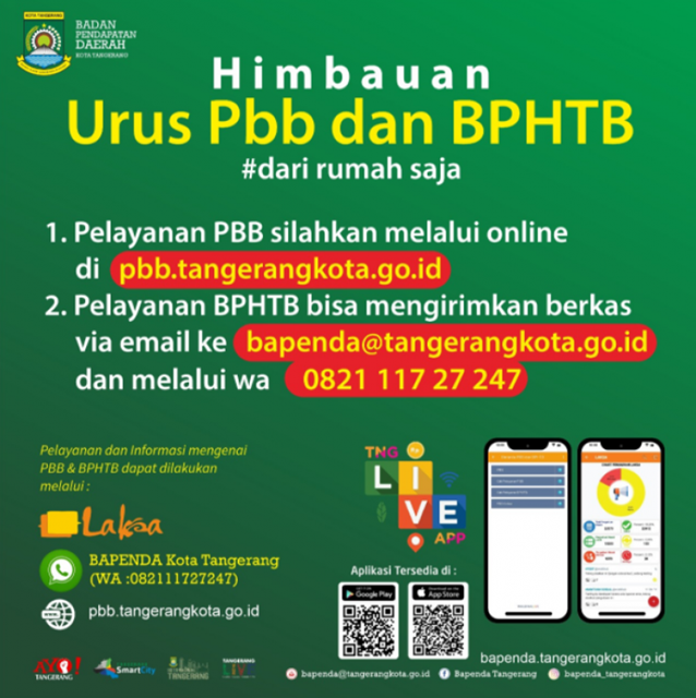 Disebutkan, pelayanan PBB dapat diakses melalui pbb.tangerangkota.go.id. Sementara itu, urusan BPHTB dapat dilakukan dengan mengirimkam berkas ke email bapenda@tangerangkota.go.id atau nomor whatsapp 0821 117 27 247.