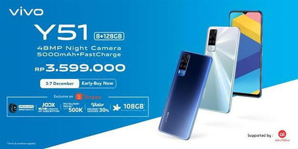 Vivo Y51 sudah bisa didapatkan melalui program Early Buy mulai hari Kamis, 3 Desember 2020 sampai 7 Desember 2020, secara eksklusif di Shopee, sebagai e-commerce partner Vivo. Setiap pembelian Y51 pada periode program Early Buy ini, konsumen bisa mendapatkan hadiah langsung berupa Smartwatch, gratis berlangganan JOOX selama satu bulan, dan voucher diskon langganan Vidio sebesar 30%. Selain itu, konsumen juga akan mendapatkan keuntungan kartu perdana XL dengan kuota 108GB untuk 1 tahun. Konsumen bisa mendapatkan keuntungan cicilan 0% untuk setiap pembelian menggunakan kartu kredit dan bagi pembelian di platform Akulaku, konsumen akan mendapatkan potongan cicilan 5% hingga Rp500.000. Syarat dan ketentuan berlaku.
