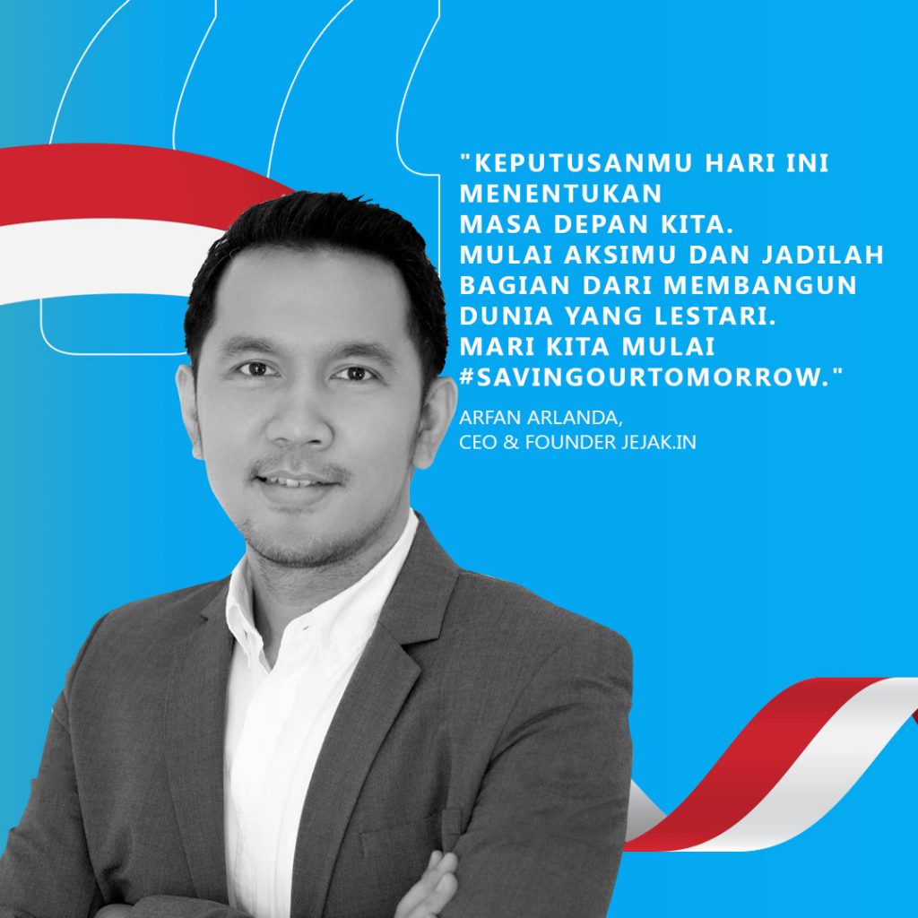 Arfan Arlanda, CEO dan Founder dari Jejak.in, perusahaan teknologi rintisan yang memiliki misi untuk mempercepat aksi iklim melalui solusi berbasis AI dan IoT. “Keputusanmu hari ini menentukan masa depan kita. Ambil tindakan dan bangunlah dunia yang berkelanjutan. Mari kita mulai selamatkan hari esok,” ujar Arfan Arlanda.