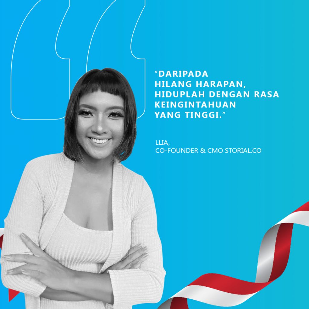Di dunia literasi digital ada Aulia Halimatussadiah, Co-founder & CMO Storial.co, platform untuk membaca novel online dan mengunggah cerita di mana saja dan kapan saja. Di masa pandemi ini. Lia berpesan kepada anak muda Indonesia, “Daripada hilang harapan, hiduplah dengan rasa keingintahuan yang tinggi.”
