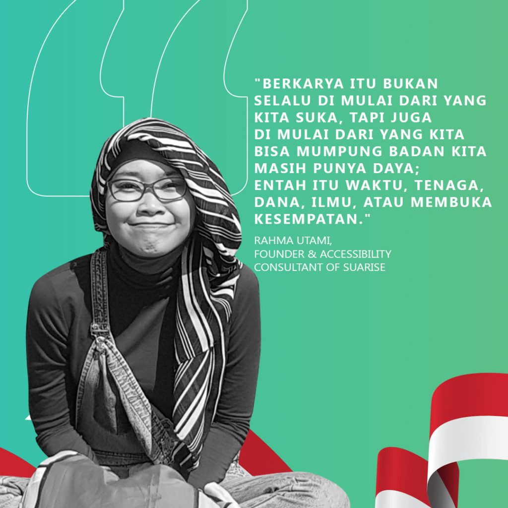 Rahma Utami, Founder dan Konsultan Aksesibilitas Suarise, perusahaan sosial end-to-end yang berfokus pada penyediaan serta promosi akses dan peluang yang setara ke Internet dan digital bagi penyandang disabilitas, terutama bagi penyandang tunanetra.