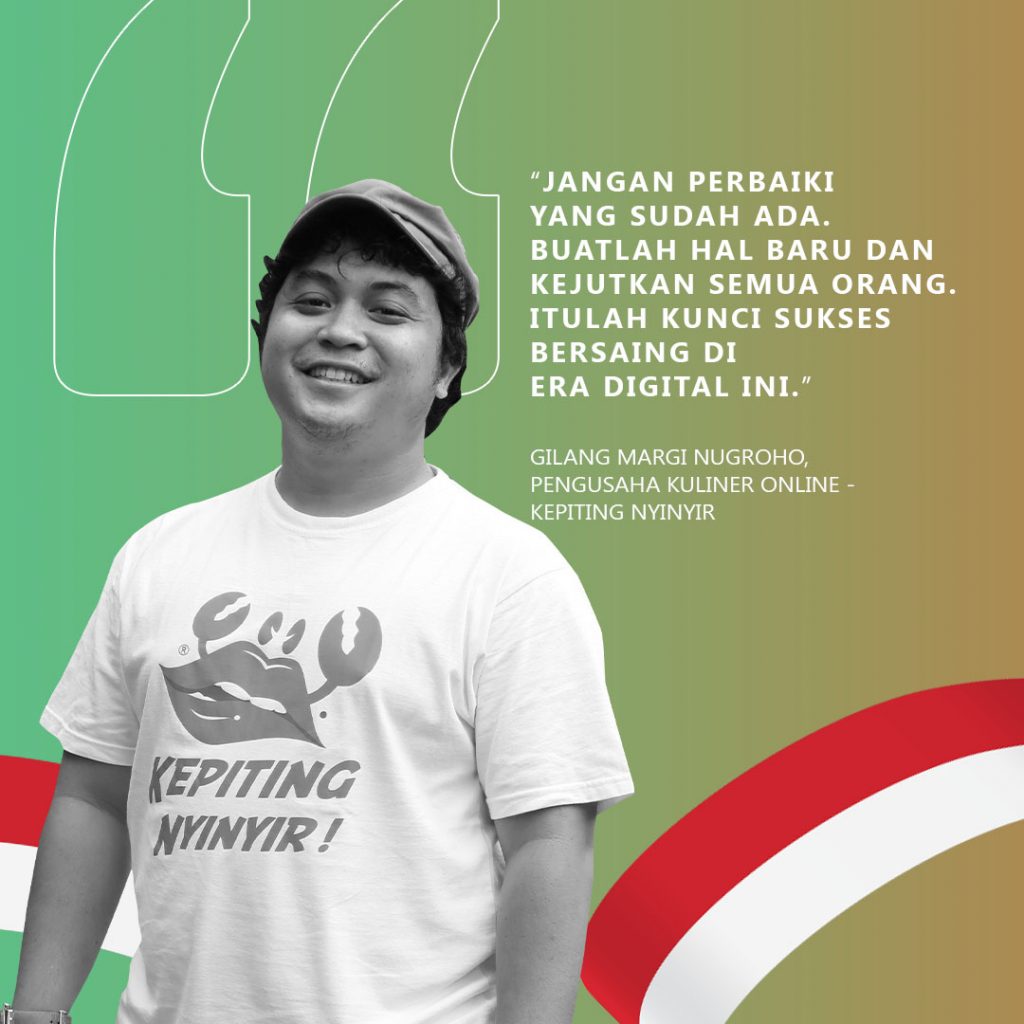 Gilang Margi Nugroho, pengusaha kuliner online dengan nama Kepiting Nyinyir. Dengan kekuatan media sosial, ia membangun bisnis kuliner tanpa memiliki restoran dengan memberdayakan ibu-ibu rumah tangga di area tempat tinggalnya. “Jangan perbaiki yang sudah ada. Buatlah hal baru dan kejutkan semua orang. Itulah kunci sukses bersaing di era digital ini,” kata Gilang.