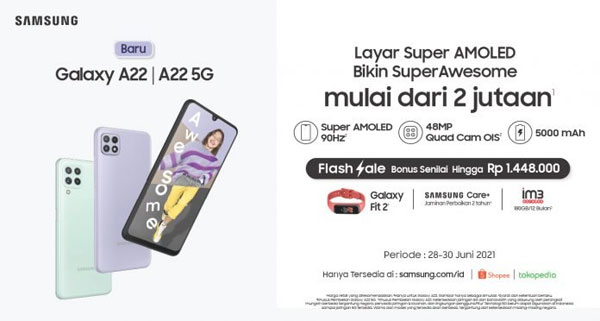 “Dengan layar Super AMOLED 90Hz refresh rate dan Quad Camera 48MP+OIS, Samsung Galaxy A22 LTE adalah pilihan dengan fitur premium di bawah 3 juta untuk jadi teman setia pendukung beragam aktivitas generasi muda. Kejar bonus langsung Awesome berupa Samsung Galaxy Fit2 senilai Rp699.000, serta kuota data dari Indosat Ooredoo 180GB setahun selama Flash Sale tanggal 28-30 Juni 2021, cuma di Samsung.com dan Shopee,” lanjut Irfan.