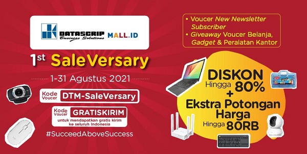 DatascripMall.ID menghadirkan promo “1st SaleVersary” #Succeed Above Success” berupa diskon hingga 80% + ekstra voucer hingga Rp80.000 untuk berbagai produk, giveaway, flash sale, live shopping, seller voucer, voucer new subscriber, voucer gratis ongkir, voucer belanja dan berbagai ekstra voucer lainnya selama bulan Agustus 2021 ini.