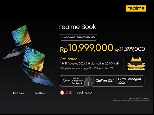 Realme Book dibanderol dengan harga Rp10.999.000 yang sangat sesuai dengan kebutuhan kreator muda Indonesia. Eksklusif untuk Realme Fans bisa mendapatkan potongan Rp 100K lagi dengan menggunakan kode voucher “REALMEFANFESTIVAL” saat check out troli di JD.ID, sehingga harganya turun menjadi Rp10.899.000.