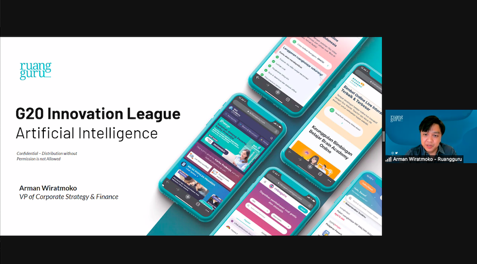 Jakarta, ItWorks- Ruangguru, perusahaan teknologi pendidikan, terpilih menjadi salah satu Top 10 Startup unggulan dalam forum internasional G20 Innovation League 2021 yang diselenggarakan di Sorrento, Italia, pada 9-10 Oktober 2021. Ruangguru, yang dipilih oleh Kementerian Komunikasi dan Informatika (Kominfo) Republik Indonesia sebagai salah satu perwakilan startup Indonesia, berhasil meraih juara 2 untuk kategori Kecerdasan Rekayasa atau Artificial Intelligence (AI).