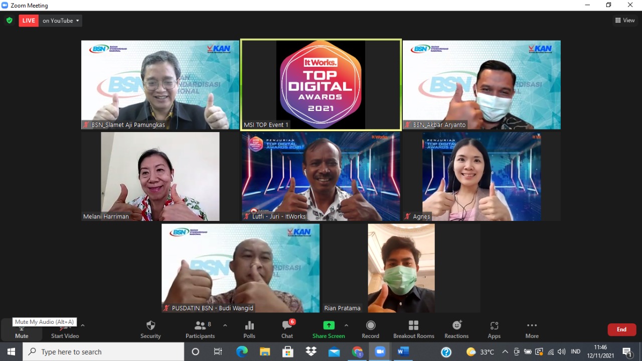 Demikian disampaikan Slamet Aji Pamungkas selaku Kepala Pusat Data dan Informasi BSN, dalam Penjurian TOP Digital Awards 2021, secara online, 12/11/2021.