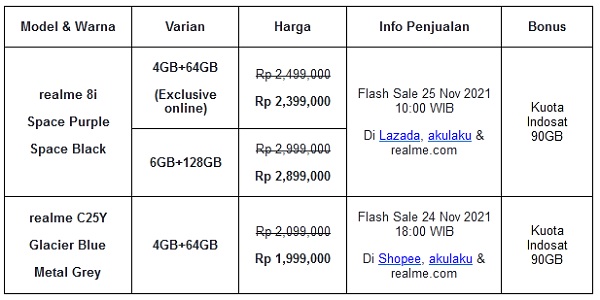 Di Indonesia, realme 8i varian 4GB+64GB ditawarkan secara eksklusif online sedangkan 6GB+128GB akan dijual melalui program flash sale di Lazada, akulaku, dan realme.com besok. Untuk realme C25Y mulai dijual hari ini melalui flash sale di Shopee, akulaku, dan realme.com.