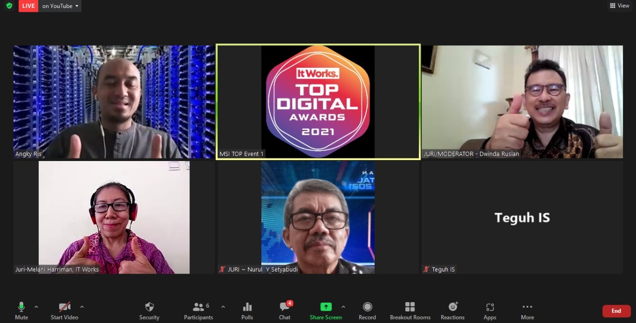 Bertindak sebagai dewan juri dalam sesi Penjurian TOP Digital Awards 2021 ini yaitu Dwinda Ruslan dan Melani Harriman dari majalah IT Works, dan Nurul Y. Setyabudi dari Indonesian Telecommunication User Group.