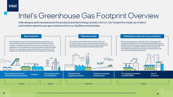 Intel juga berkomitmen untuk mengatasi dampak iklim di seluruh rantai nilai di hulu dan hilir, yang juga dikenal sebagai Scope 3 Emissions. Strategi Scope 3 Intel berfokus pada kemitraan dengan pemasok dan pelanggan untuk mengambil tindakan agresif guna mengurangi emisi secara keseluruhan.