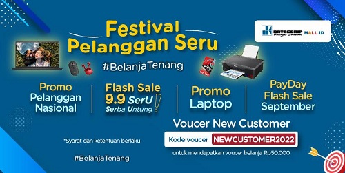 DatascripMall.ID memberikan promo spesial untuk para pelanggan dengan tema “Festival Pelanggan Seru #BelanjaTenang”. Promo menarik yang dihadirkan, mulai dari Promo Pelanggan Nasional, Festival Pelanggan Seru, Flash Sale 9.9, Payday Flash Sale, hingga Promo Laptop Baru Harga Seru serta voucer khusus untuk pelanggan baru di periode bulan September 2022.
