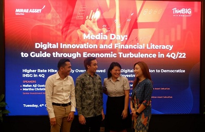 “Inovasi digital dengan menjalankan literasi keuangan adalah cara mencapai tujuan sederhana kami yaitu mendemokratisasi investasi. Capaian tersebut bukanlah tujuan akhir, tetapi merupakan bagian dari proses panjang Mirae Asset Sekuritas untuk lebih baik lagi ke depannya,” ujar Denny dalam Media Day: October by Mirae Asset Sekuritas, 4 Oktober 2022.