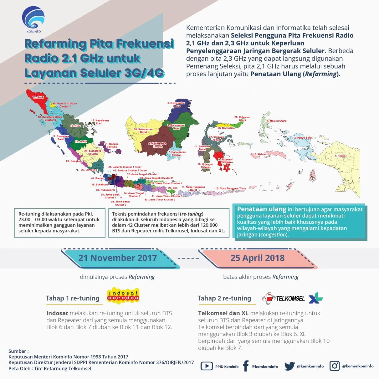 Kementerian Komunikasi dan Informatika (Kementerian Kominfo) menyatakan penataan ulang atau refarming pita frekuensi radio 2,1 GHz secara nasional telah selesai.