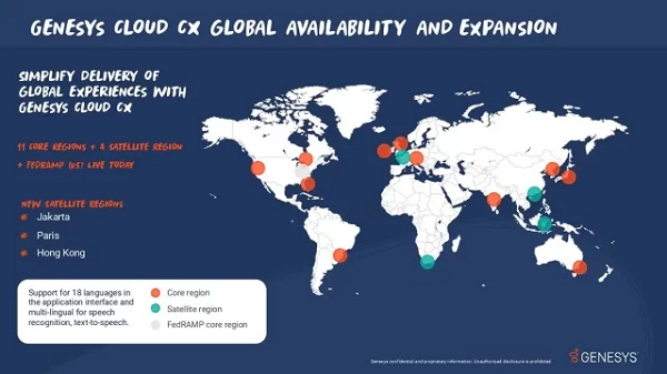 Selain di Indonesia, satelit regional Genesys Cloud CX juga hadir di Paris, Perancis dan Hong Kong, Daerah Administratif Khusus China. Dengan penambahan satelit ini, Genesys Cloud CX kini memiliki 12 wilayah inti dan 4 wilayah satelit di seluruh dunia yang memperkuat posisi Genesys sebagai penghubung cloud global.