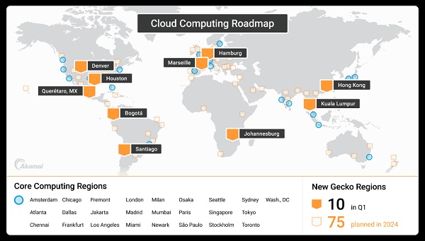 Akamai telah menjalankan roadmap Gecko yang cepat namun pragmatis. Pada fase pertamanya, yang diumumkan hari ini, Akamai berencana untuk menghadirkan komputasi dengan dukungan untuk mesin virtual di 100 kota sebelum akhir tahun ini. Pada tahun 2024, Akamai telah membangun region baru dengan arsitektur Gecko di Hong Kong SAR; Kuala Lumpur, Malaysia; Querétaro, Meksiko; dan Johannesburg, Afrika Selatan, serta di kota-kota yang belum diramaikan oleh para hyperscaler, seperti Bogotá, Kolombia; Denver, Colorado; Houston, Texas; Hamburg, Jerman; dan Marseille, Prancis.