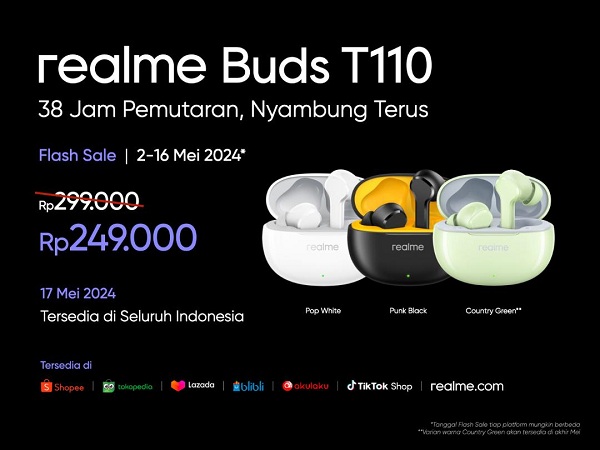realme Buds T110 dapat dimiliki dengan harga spesial Rp249.000 selama Flash Sale pada periode 2 – 16 Mei 2024, di Shopee, Tokopedia, Lazada, Blibli, Akulaku, Tiktok Shop, dan realme.com. realme Buds T110 varian warna Country Green akan mulai tersedia pada akhir Bulan Mei 2024.