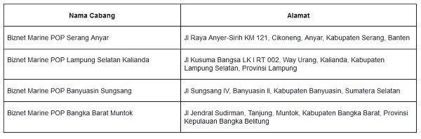Dalam pembangunan infrastruktur kabel bawah laut ini, Biznet juga melakukan Corporate Social Responsibility (CSR) dengan memberikan layanan Internet gratis selama 1 tahun kepada 100 Kepala Keluarga yang berada di area dekat Biznet MarinePOP yang berlokasi di Kalianda – Kabupaten Lampung Selatan, Sungsang – Kabupaten Banyuasin, Sumatra Selatan dan Muntok – Kabupaten Bangka Barat, Kepulauan Bangka Belitung.