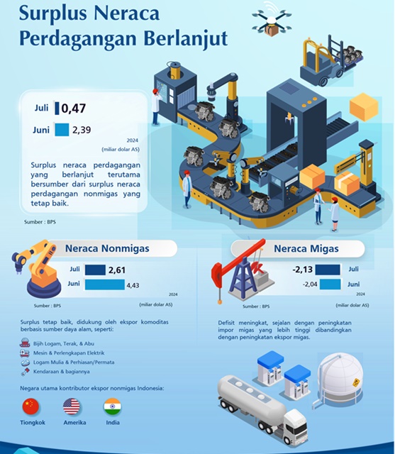 Disebutkan, surplus neraca perdagangan yang berlanjut terutama bersumber dari surplus neraca perdagangan nonmigas yang tetap baik. Neraca perdagangan nonmigas Juli 2024 mencatat surplus sebesar US$2,61 miliar sejalan dengan ekspor nonmigas yang meningkat mencapai US$20,79 miliar dan impor nonmigas yang juga meningkat mencapai US$18,18 miliar.