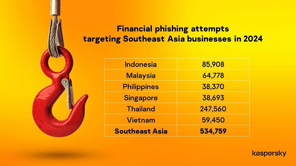 Disebutkan pada tahun 2024, solusi keamanan bisnis Kaspersky berhasil memblokir lebih dari setengah juta upaya untuk mengklik tautan phishing keuangan (financial phishing) pada perangkat bisnis (Perusahaan) di Asia Tenggara.