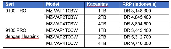 9100 PRO Series model 1TB, 2TB, dan 4TB akan tersedia mulai 4 April 2025 melalui Samsung Online Store, Samsung Official Store di Lazada dan Shopee, serta toko elektronik konsumen terpilih. Model 8TB akan tersedia mulai Juni 2025.