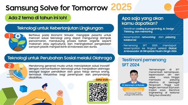 Bagi Samsung, program Solve for Tomorrow 2025 (SFT) merupakan komitmen untuk mendukung inovasi dan pengembangan teknologi yang dimulai sejak usia muda. Pendaftaran program ini dibuka mulai tanggal 19 April hingga 17 Mei 2025. Pendaftaran dan jadwal SFT 2025 dapat dilihat di situs Samsung Solve For Tomorrow.