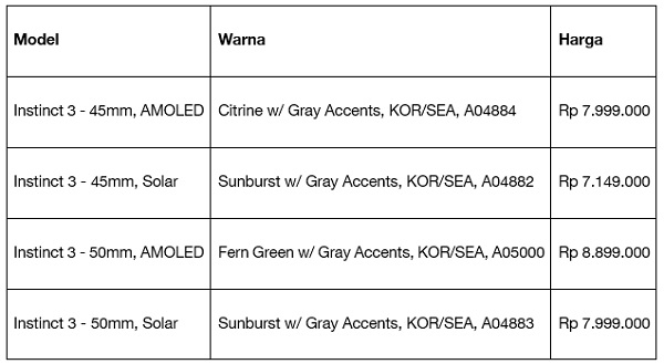Varian warna terbaru Garmin Instinct 3 (AMOLED dan Solar) resmi tersedia mulai hari ini melalui Garmin Official Stores Online seperti di Shopee, Tokopedia, TikTok, Blibli, Lazada dan Eraspace. Sementara untuk Garmin Brand Store Offline seluruh Indonesia baru akan tersedia pada 6 Mei 2026.