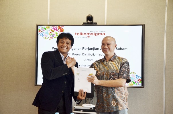 Jakarta – PT Telkom Indonesia melalui anak perusahaanya, PT Sigma Cipta Caraka (Telkom Sigma), secara resmi mengakuisisi PT Bosnet Distribution Indonesia (BOSNET). Akuisisi ini ditandai dengan penandatanganan Perjanjian Jual Beli Saham oleh Direktur Utama Telkom Sigma Judi Achmadi di Jakarta (15/11).